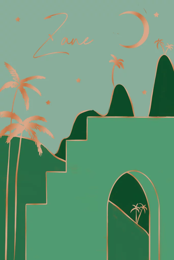 Een Arabisch getint geboortekaartje met een abstract landschap en koperfolie.