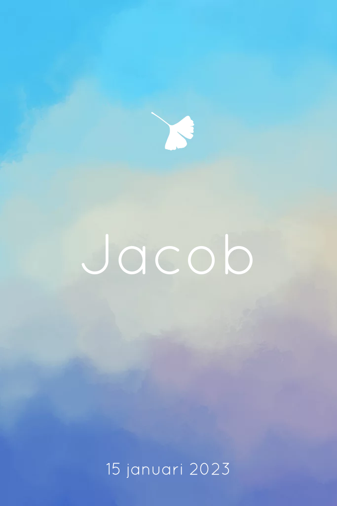 Een geboortekaartje met abstracte wolken in een blauw gekleurde lucht.
