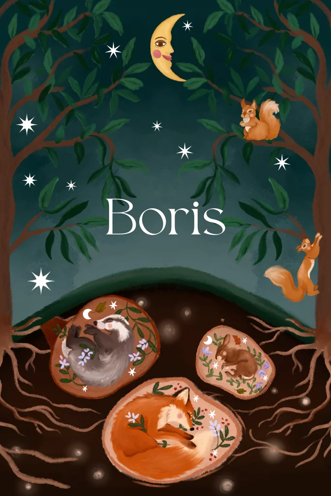 Neem een kijkje in het leven in het bos. Een kaartje met bosdieren en vlinders onder het maanlicht. De meeste zijn al in diepe winterslaap.