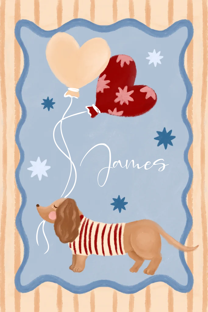 Een geboortekaartje met een schattig hondje, teckel. Hij heeft een gestreept truitje aan en ballonnen in zijn mond.