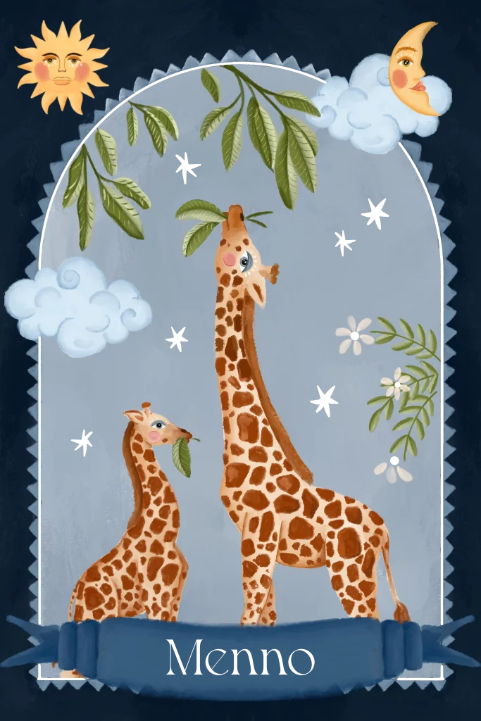 Een grote en een kleine giraf die samen genieten van bladeren aan een boom. Dit lieve ontwerp straalt de warmte en liefde uit tussen ouder en kind, perfect om de geboorte van jullie kleintje aan te kondigen. Met warme kleuren en vrolijke details is dit kaartje een prachtige manier om dit bijzondere moment te delen met vrienden en familie.