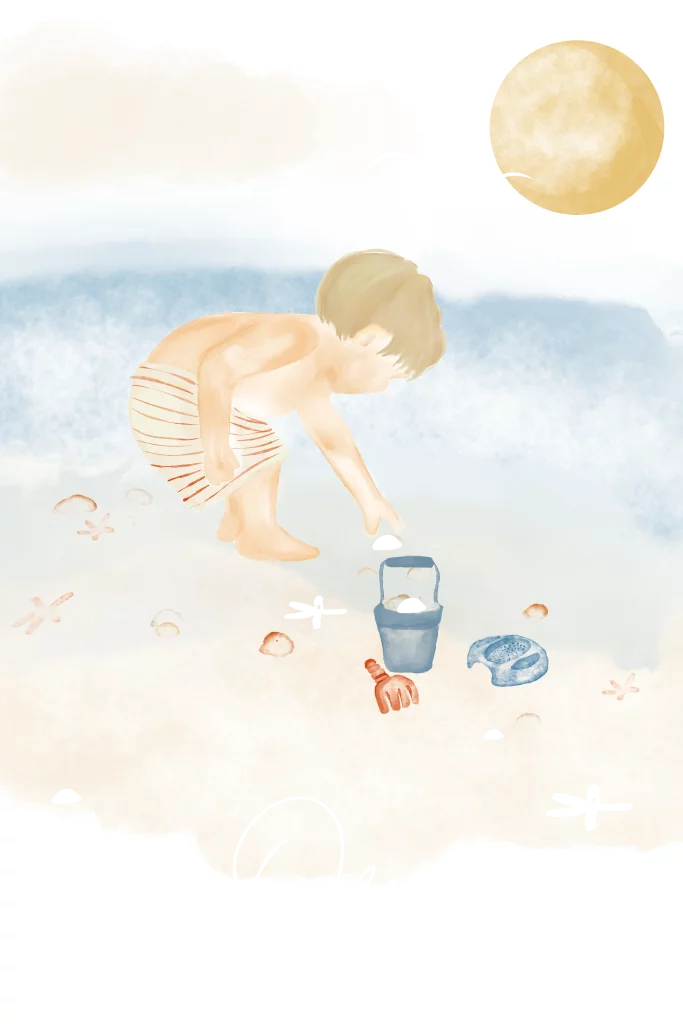 Ben je gek van het strand en zie jij je kleintje al door de branding wandelen met een schepje en een emmertje? Een geboortekaartje dat met aquarel is ingekleurd. Er zijn verschillende varianten beschikbaar voor jongens en meisjes met andere haarkleuren en huidtinten.