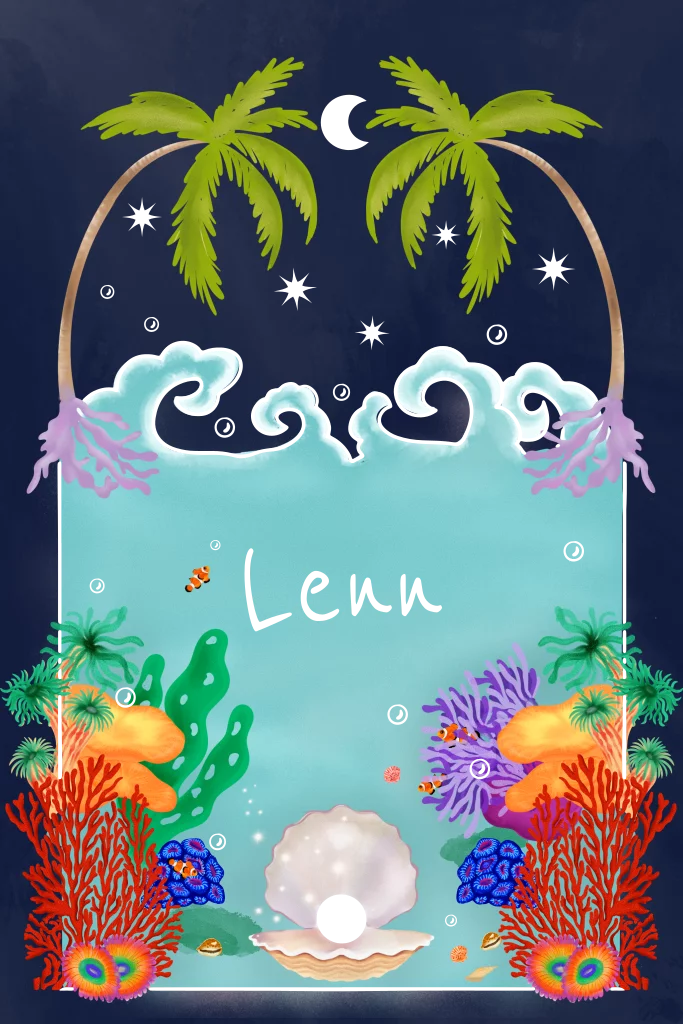 Een geboortekaartje met een magisch zeethema. De gouden parel wordt omringd door kleurrijk koraal, golvend water en palmbomen.
