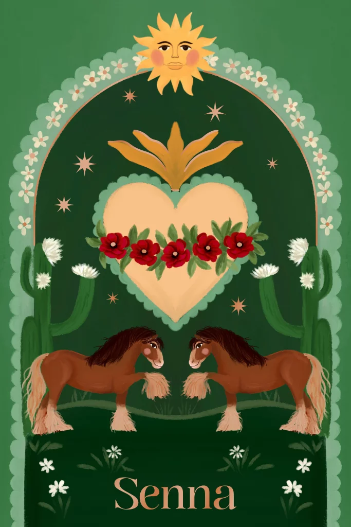 Een landelijke vibe en misschien wel een beetje Amerikaanse country. Een kaartje paarden, cactussen en een sacred heart.