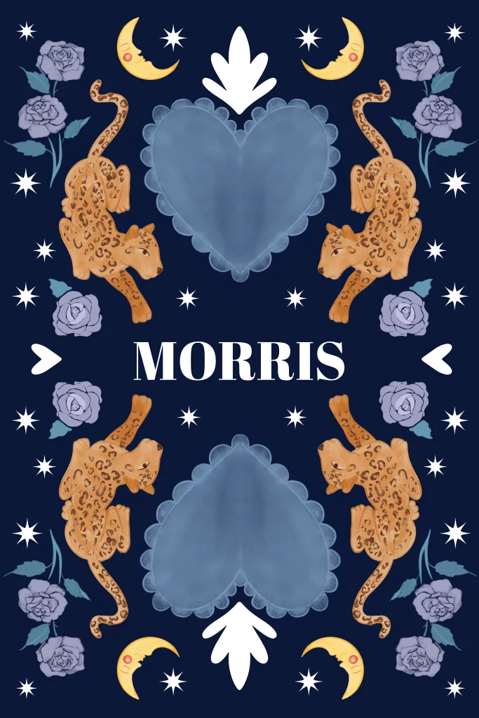 Een symmetrisch geboortekaartje met panters. Het kaartje zit verder vol rozen en gouden sterren rondom twee harten.