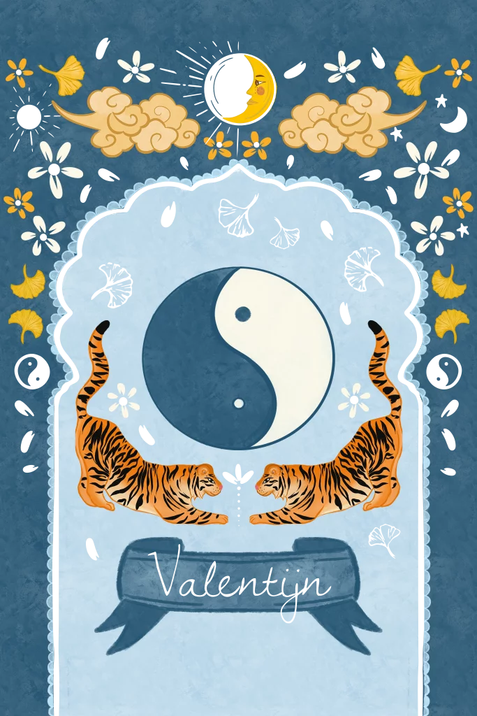 Het kaartje met de tijger is er in vele varianten. Zo kun je kiezen uit een versie met Yin Yang of een hart met optioneel het sterrenbeeld erin. Liever een andere kleur? In de editor kun je zelf de kleur aanpassen.