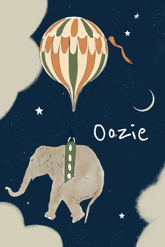 Een fantasierijk kaartje met een vliegende olifant aan een luchtballon. De kleuren kun je naar wens aanpassen.