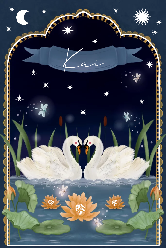 Een sprookjesachtig en romantisch geboortekaartje met twee zwanen. De, bijna lichtgevende, libellen en de sterren geven het kaartje een magisch gevoel.