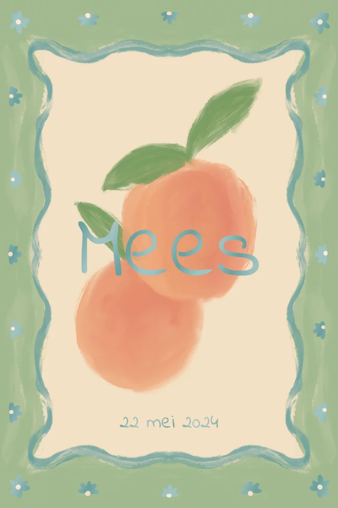 Een fris en fruitig geboortekaartje met de zomerse perzik en blauwe bloemen.