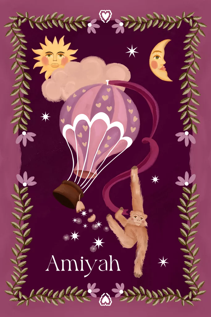Een schattig aapje hangende aan een luchtballon hoog in de wolken. Mooi diepe en warme roze kleuren.