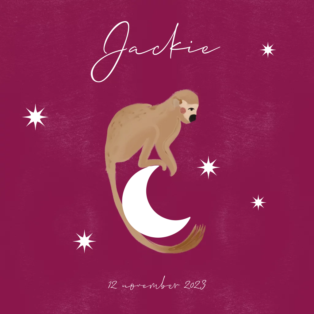 Een minimalistisch geboortekaartje met accenten in folie. De aap zit bovenop de maan.