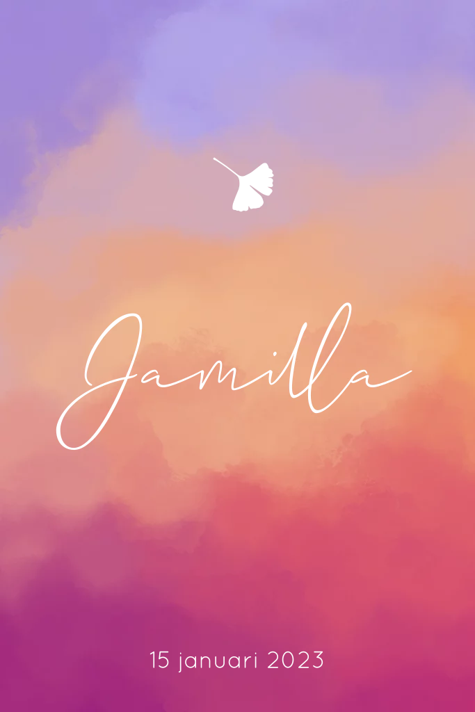 Een geboortekaartje met abstracte wolken in een blauw gekleurde lucht. Herkenbaar van de kleuren die je soms ziet bij zonsopkomst of zonsondergang.