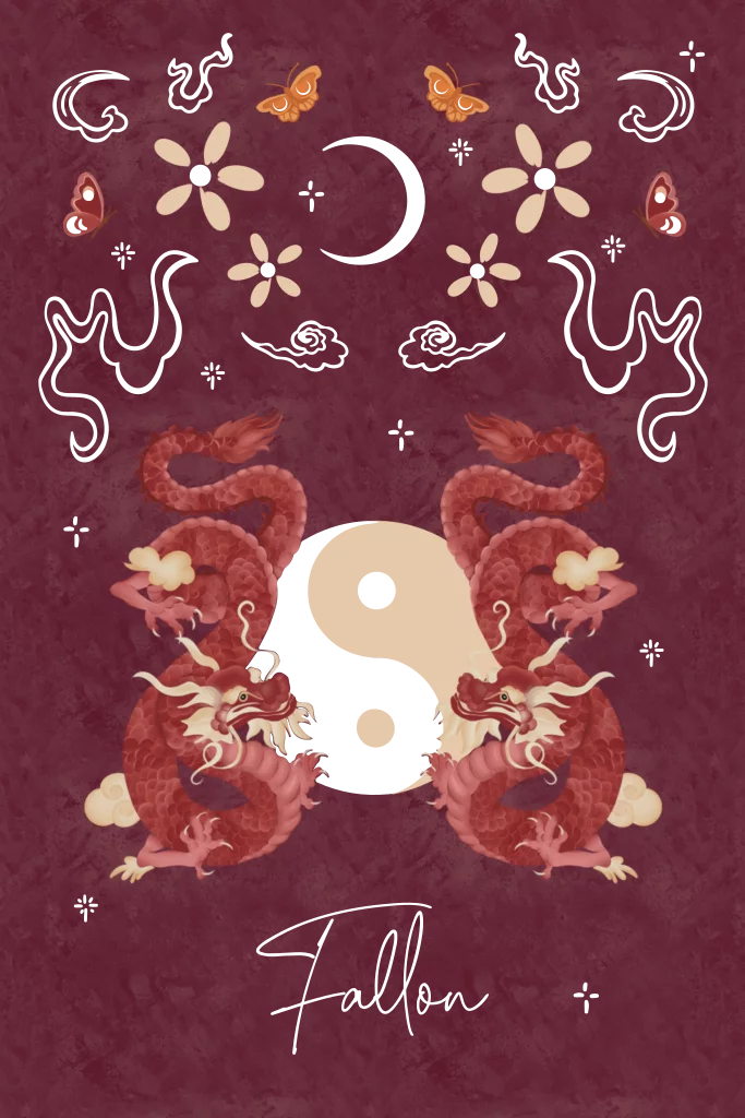 Fantasierijk geboortekaartje met Japanse draken. Het kaartje kenmerkt zich door de diepe rode kleur en het Yin yang teken.