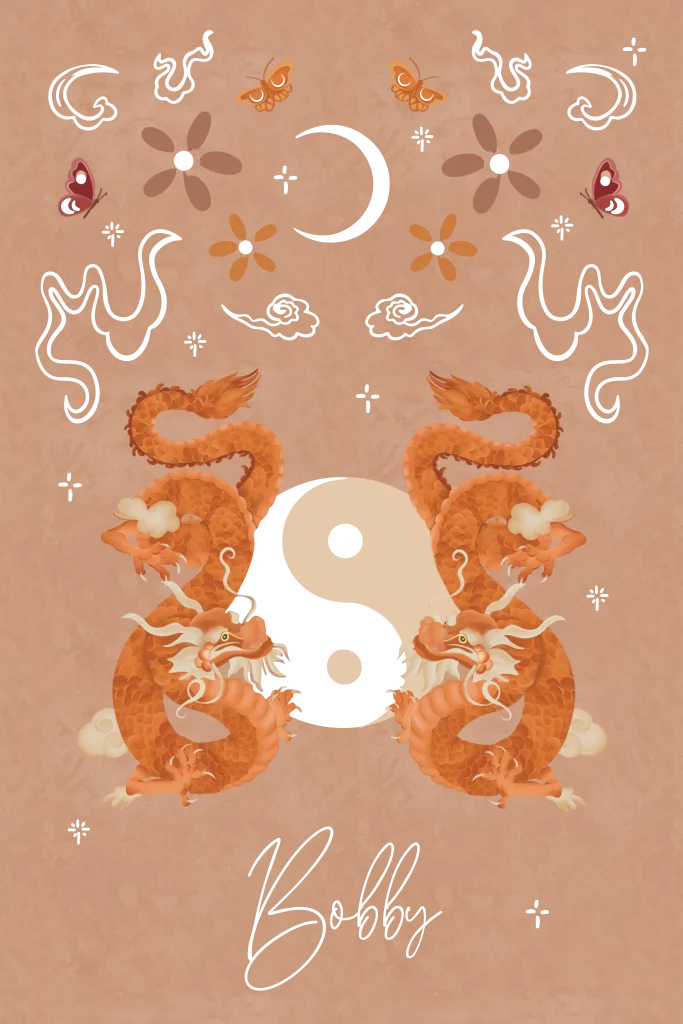 Fantasierijk geboortekaartje met Japanse draken aangevuld met het yin yang teken.