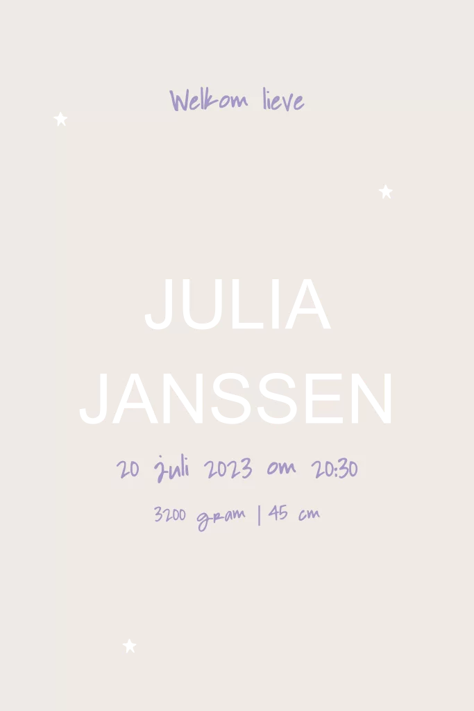 Het kaartje loopt over van de schattige lila bloemen. Personaliseer dit geboortekaartje met de maanstand van het geboortemoment van jouw kindje.