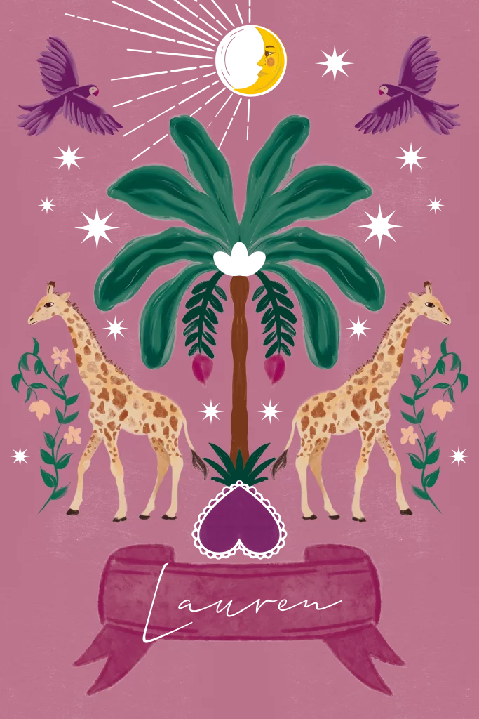 Een geboortekaartje uit het jungle thema. De giraffen staan rond de palmboom op een kaartje vol gouden details.