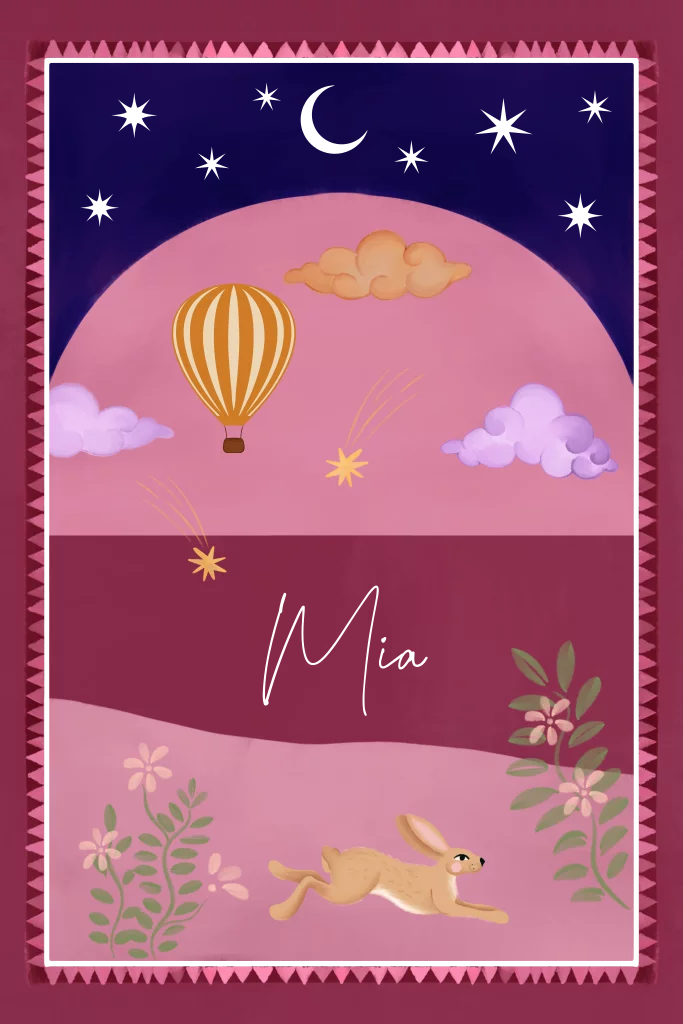 Vlieg je mee op avontuur in de luchtballon? Een heel kleurrijk geboortekaartje dat je zelf kunt aanpassen. De haas gaat er intussen weer razendsnel vandoor.