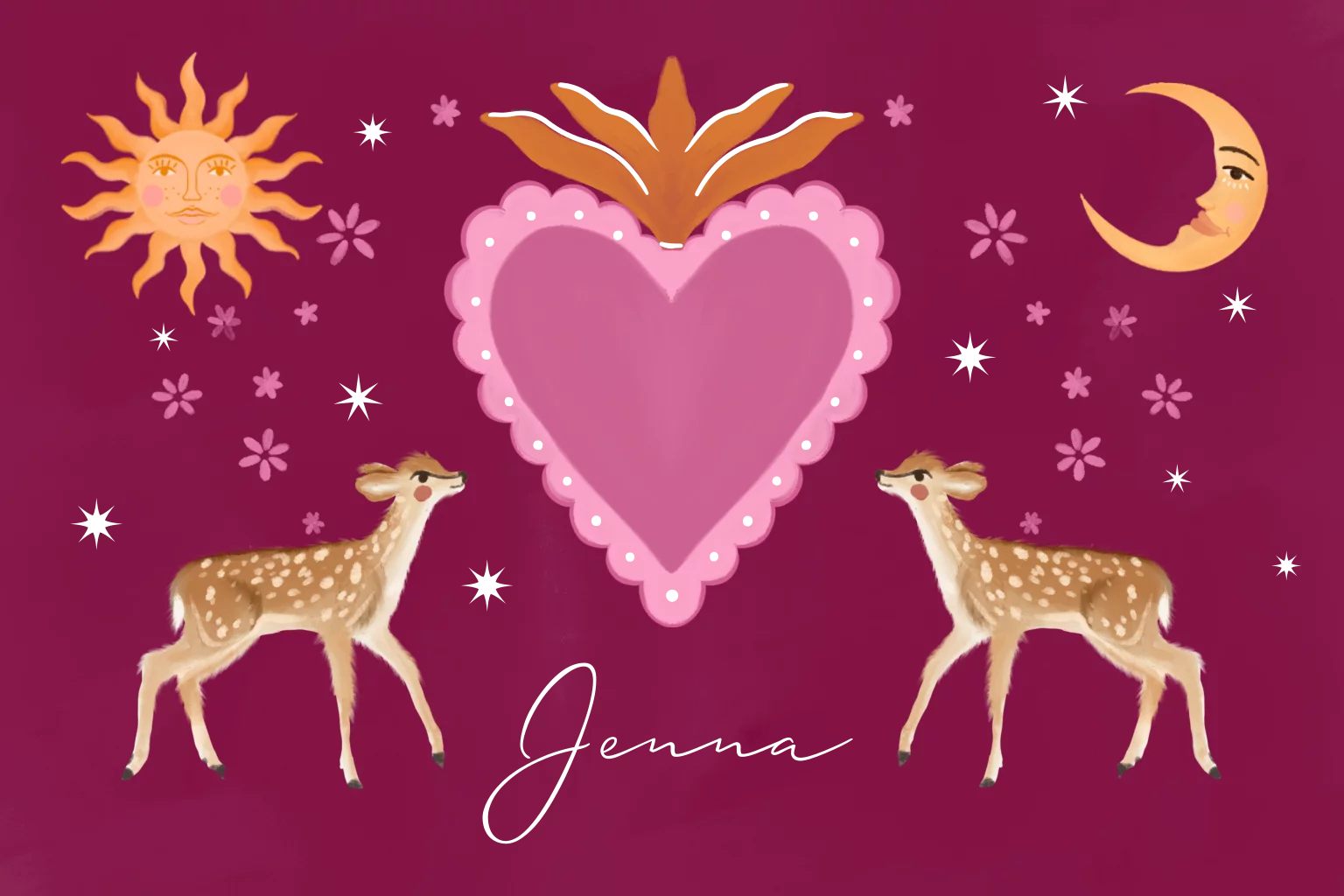 Twee schattige hertjes op een symmetrisch kaartje met een sacred hart.