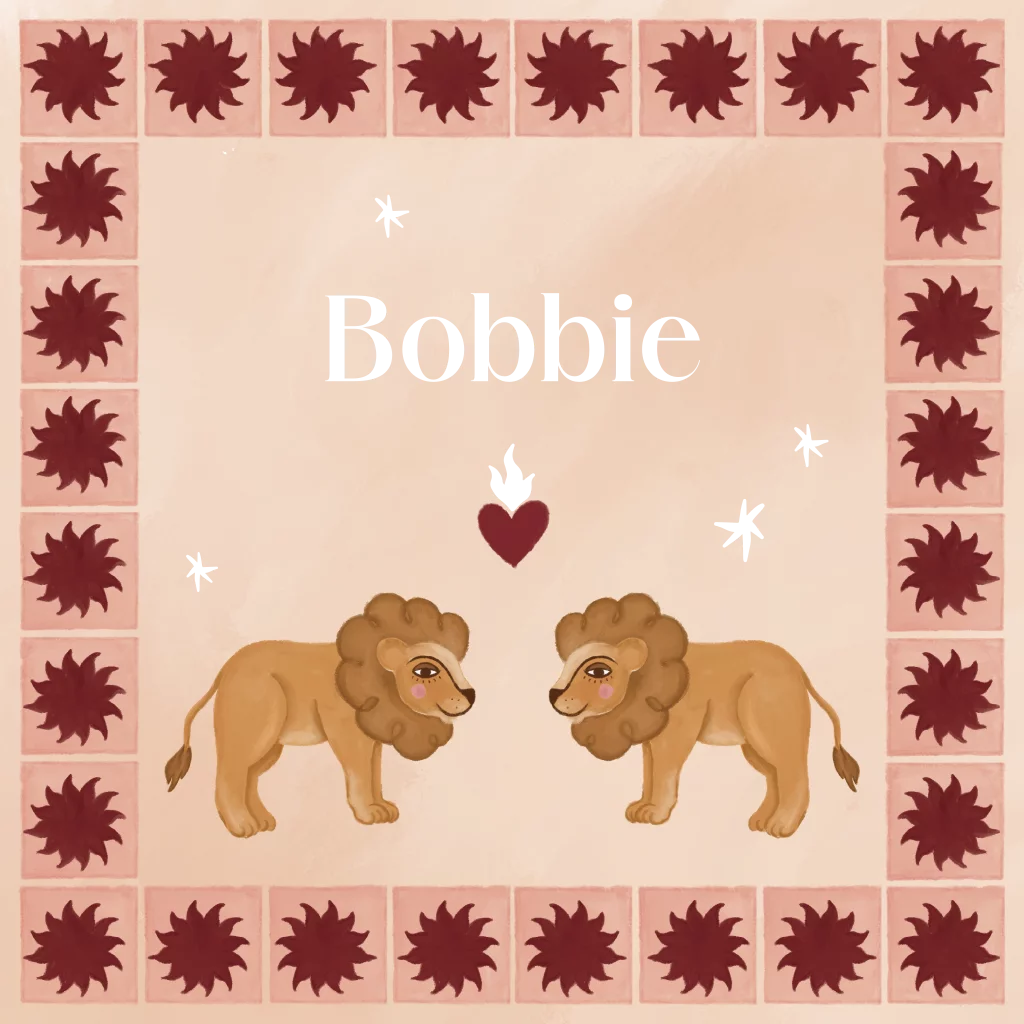 Een symmetrisch kaartje met leeuwen in roze met rood.