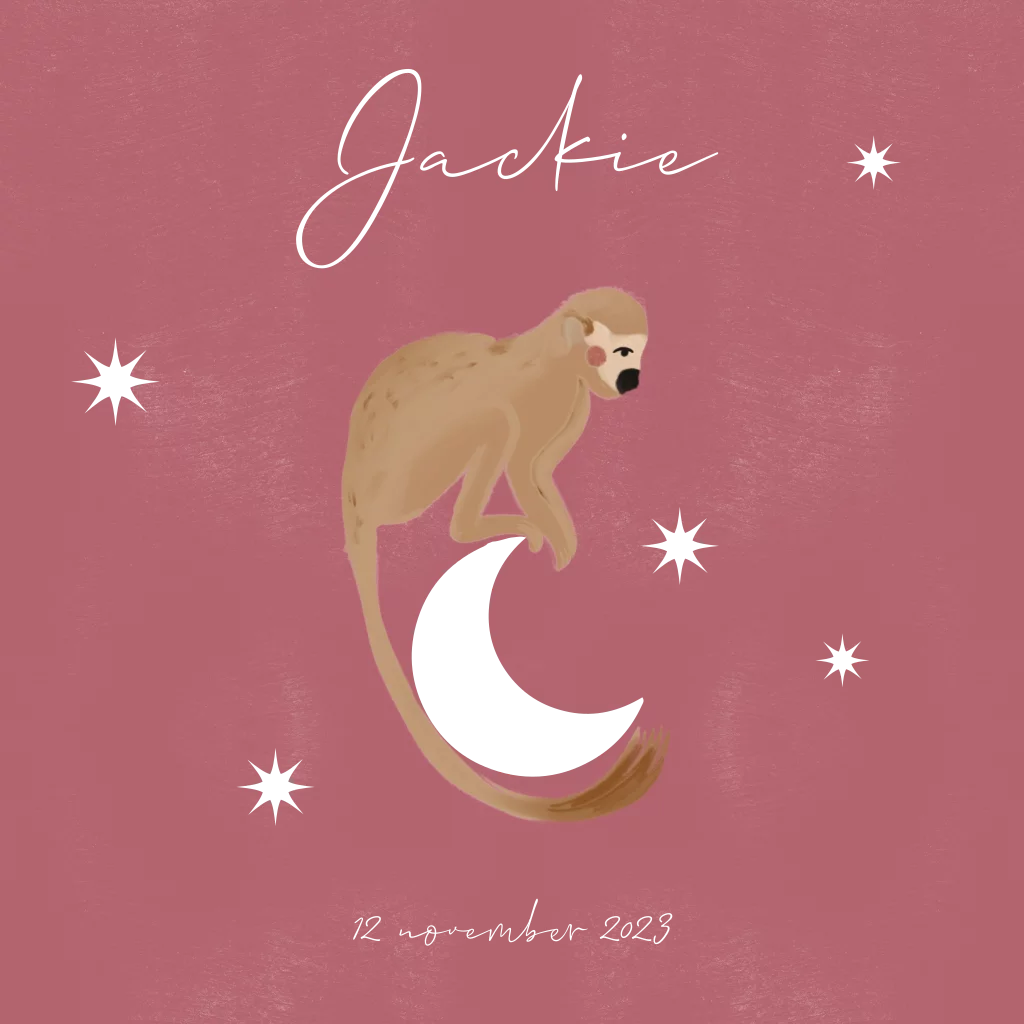 Een minimalistisch geboortekaartje met accenten in folie. De aap zit bovenop de maan.