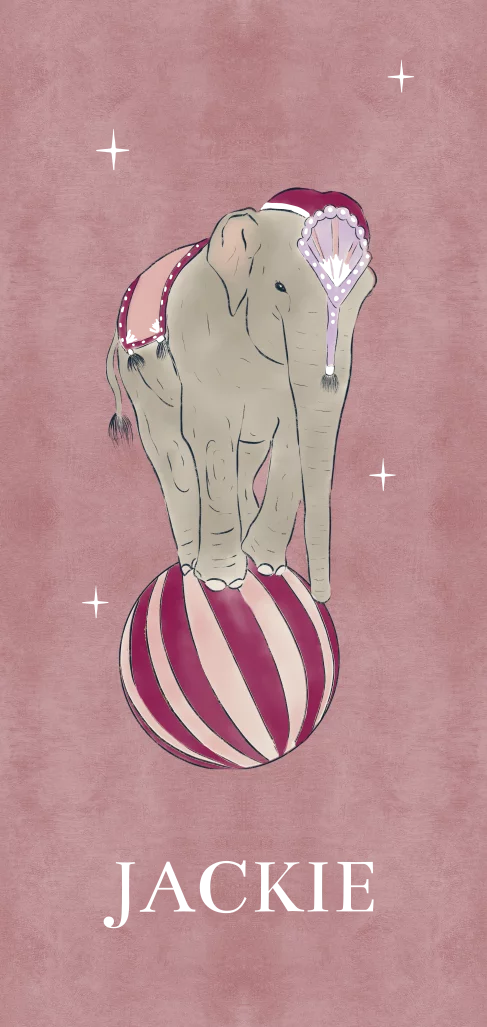 Een langwerpig geboortekaartje waarbij de versierde olifant balanseert op een circusbal. Naar wens kun je de kleuren aanpassen om het kaartje eigen te maken.