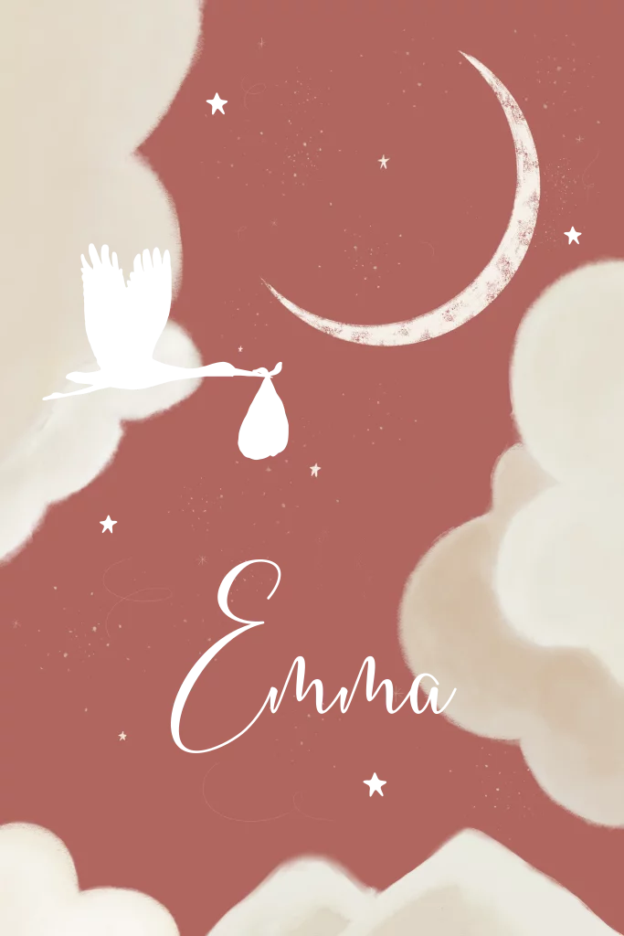 Een klassiek geboortekaartje met de ooievaar die volgens de mythe geluk en de kans op nieuw leven brengt.