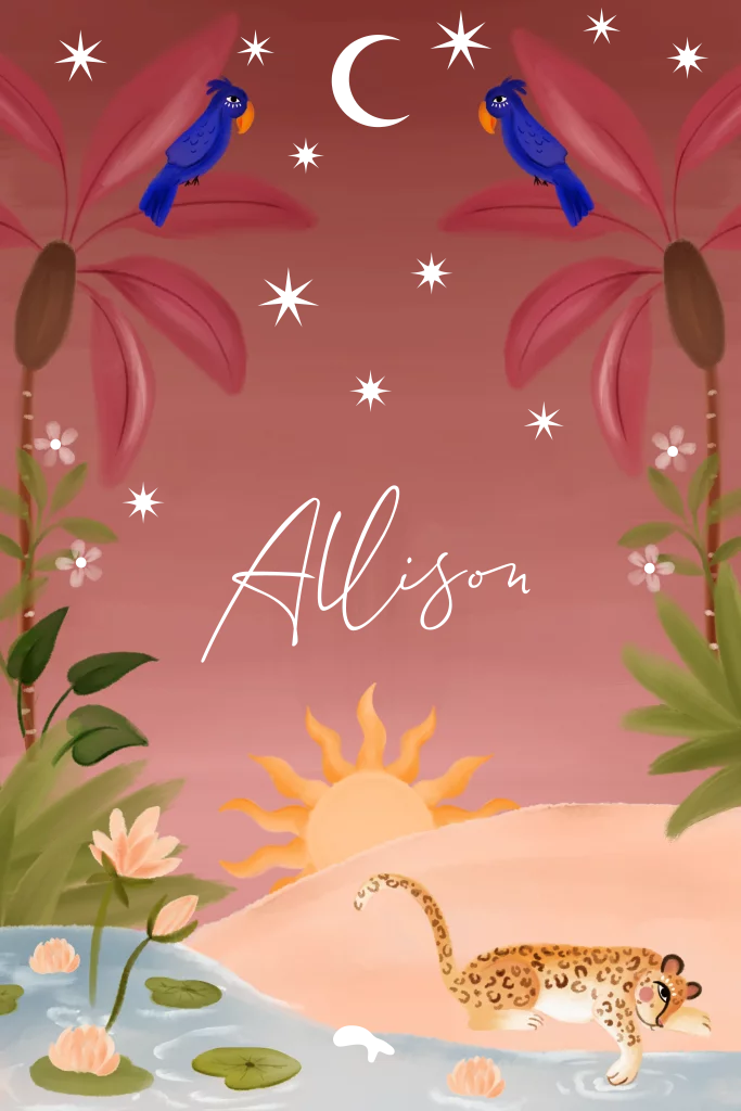 Neem een kijkje in het leven in de jungle. Een kaartje met tropische dieren en planten. Papegaaien, palmbomen en een luipaard.