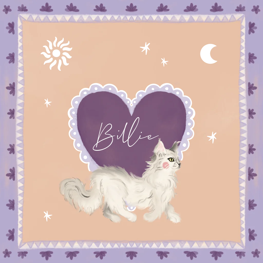 Een sierlijke witte kat op een zachte achtergrond met een hart en lila omlijsting.