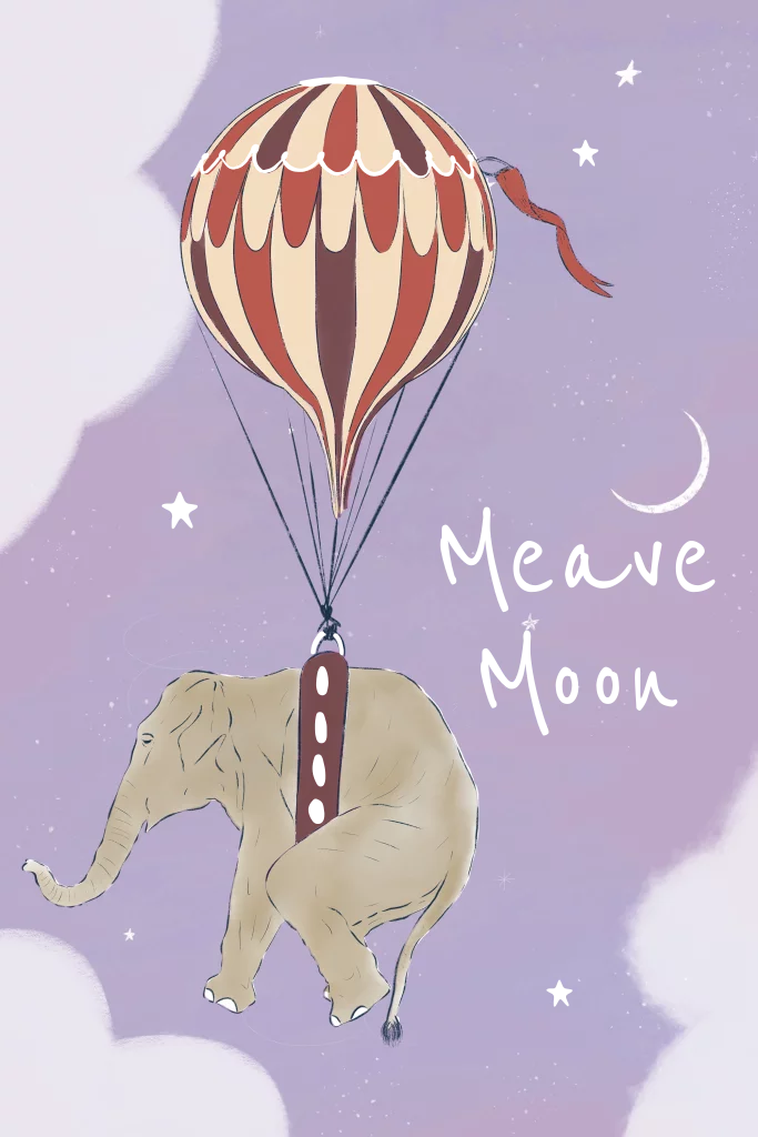Een fantasierijk kaartje met een vliegende olifant aan een luchtballon. De kleuren kun je naar wens aanpassen.