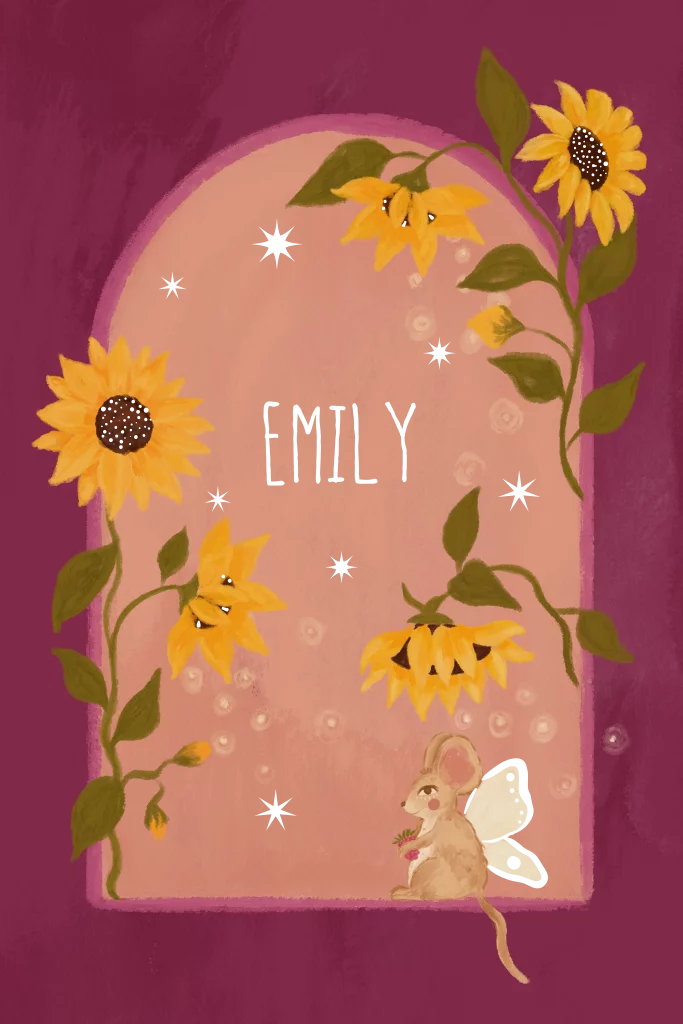 Een geboortekaartje vol met zonnebloemen en een schattig muisje.