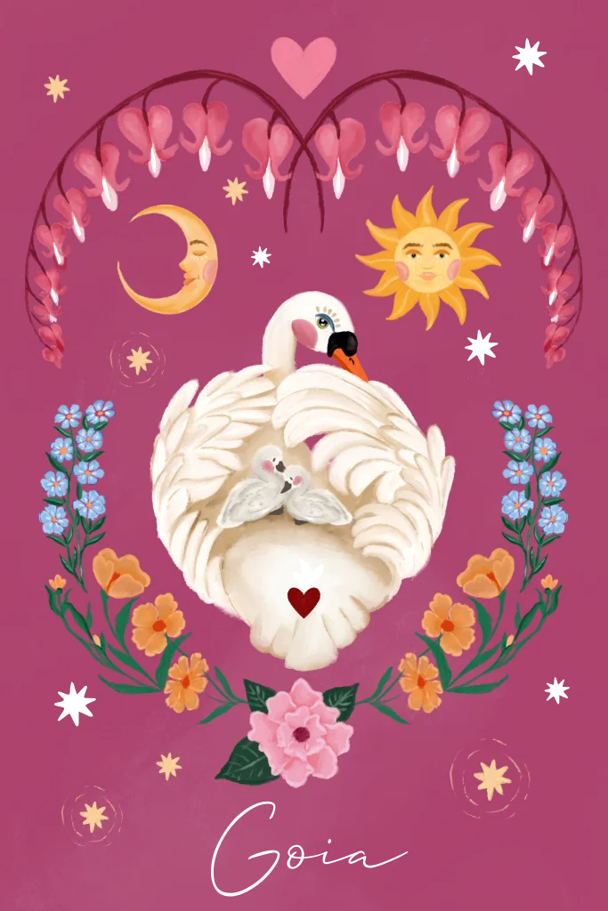 Omringd door bloemen, sterren en het zachte licht van zon en maan, symboliseert de zwaan een liefdevol begin.