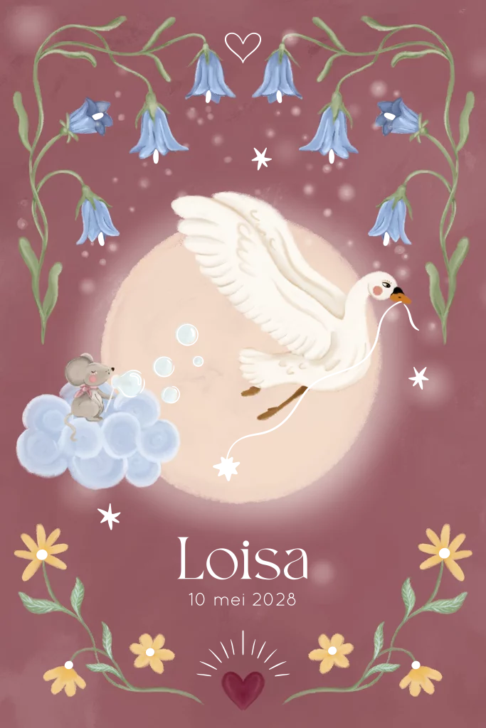 De zwaan vliegt je tegemoet. Omringd door bloemen en kleine gouden belletjes geblazen door een schattig muisje.