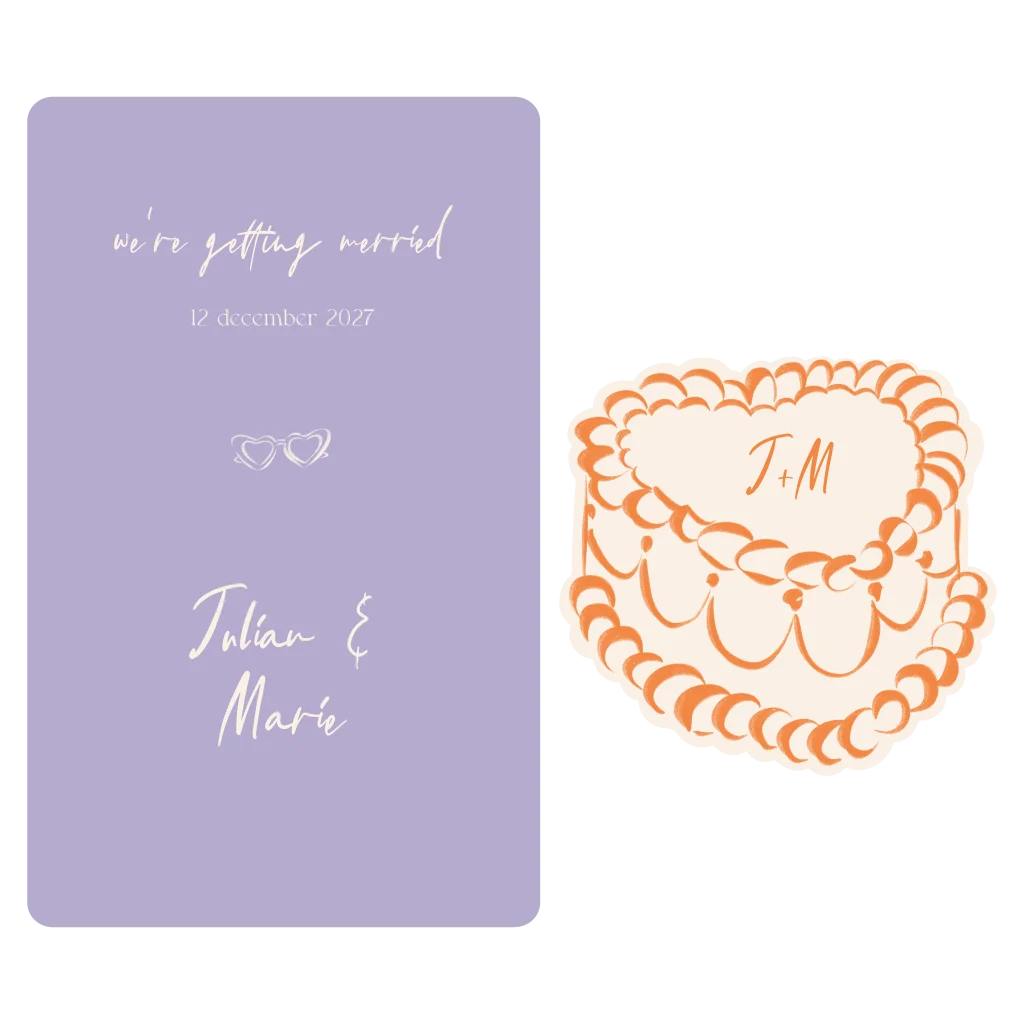 Een originele trouwkaart waar een extra kaartje bij zit in de vorm van een bruidstaart. het is een minimalistisch ontwerp, maar helemaal van deze tijd een lila en oranje kleur.