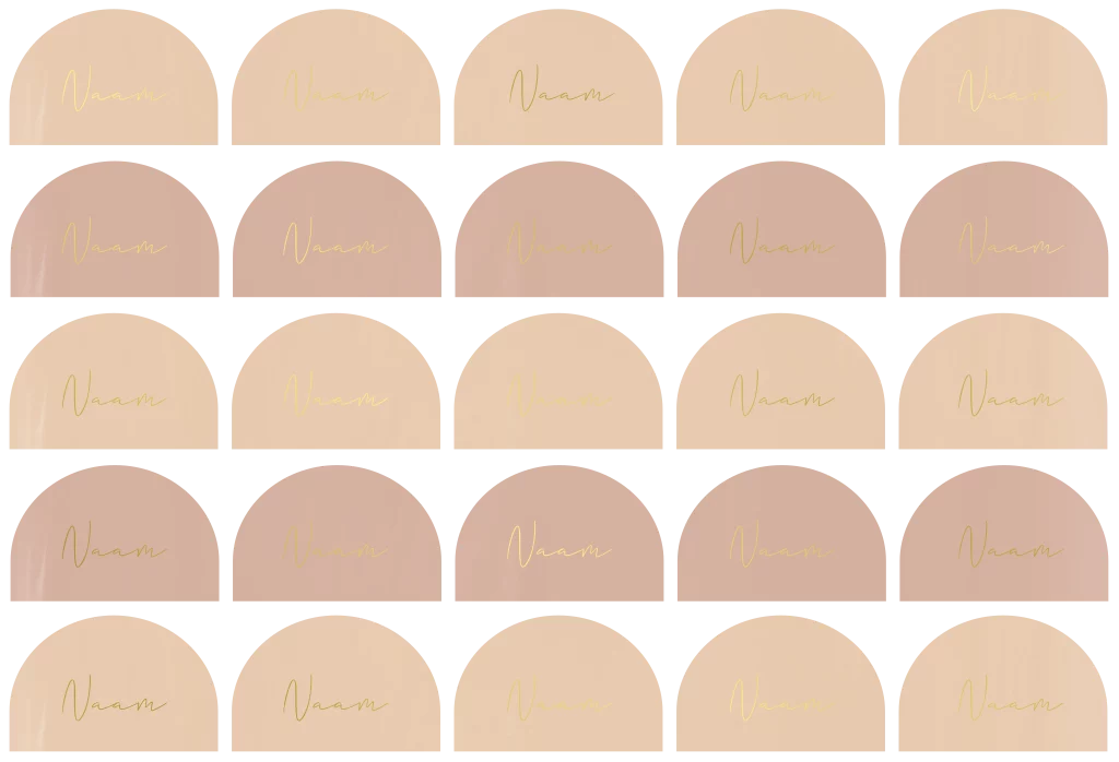 Naamkaartjes in boog vorm met zachte roze tinten.