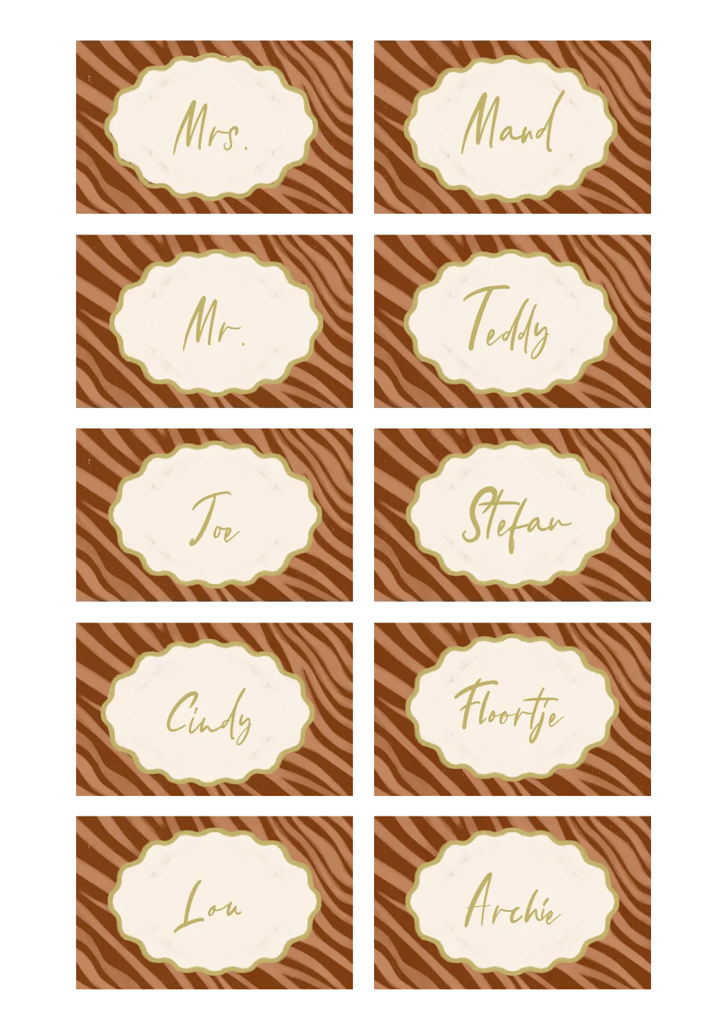 Naamkaartjes met een zebra patroon in bruin tinten.