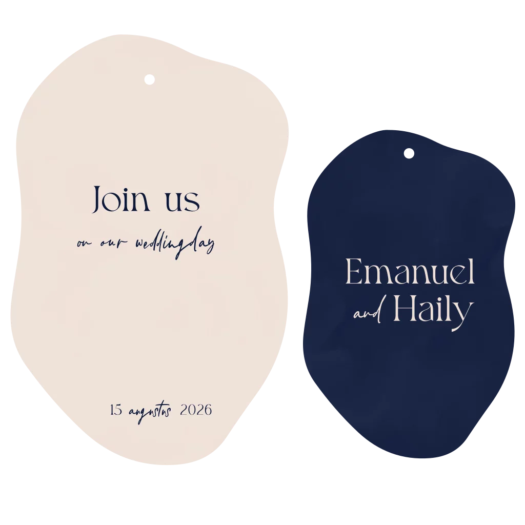 Een trouwkaart met een originele vorm in beige met blauw.