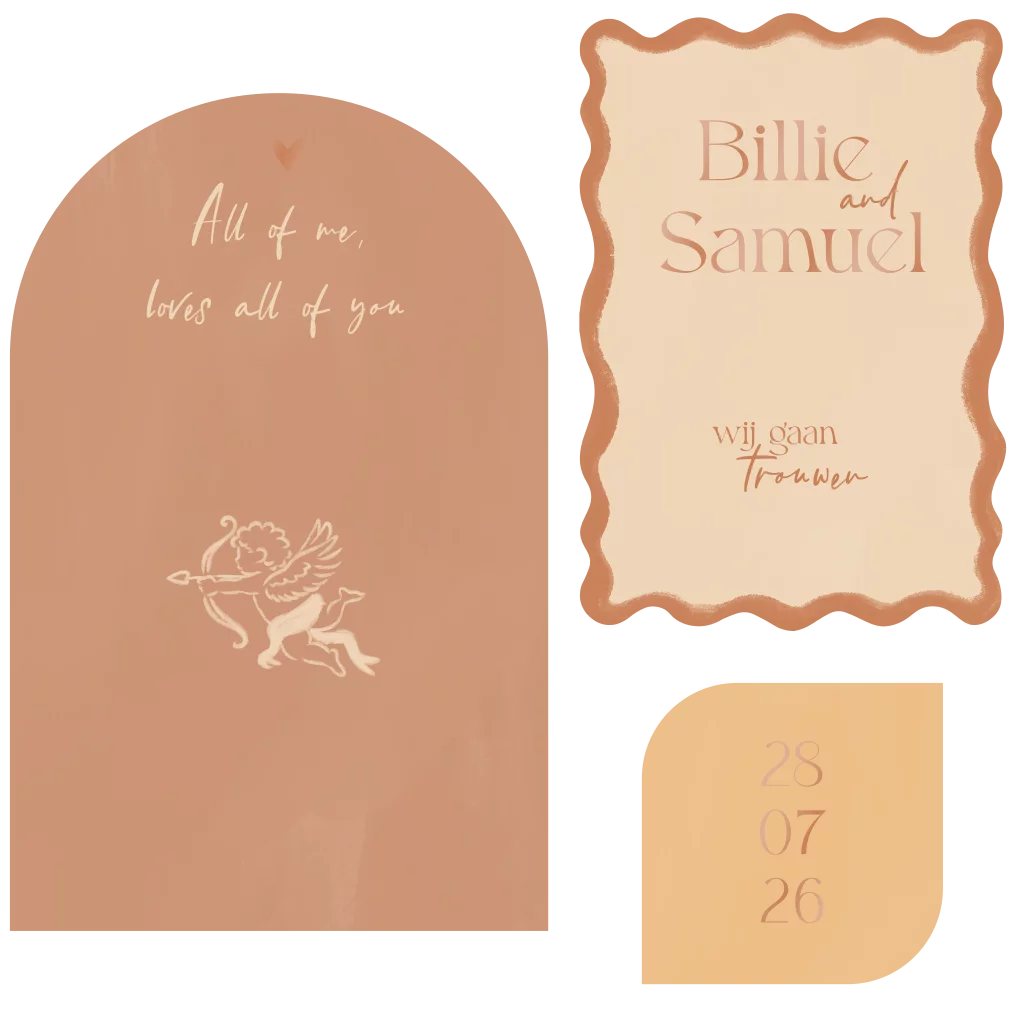 Een complete set met kaarten die je als pakketje verstuurt naar jouw genodigden. Helemaal in het teken van de liefde met cupido.