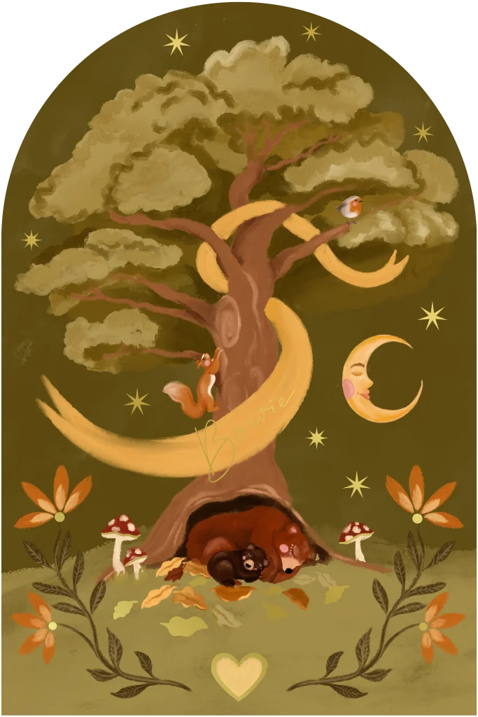 Een lief geboortekaartje met bosdieren. Twee beren slapend in een holle boom. Prachtig warme kleuren typerend voor de herfst.
