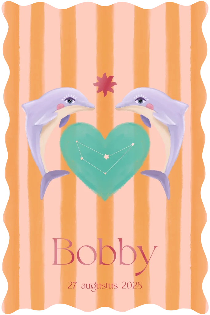 Een kleurrijk geboortekaartje met twee dolfijnen. Een gestreepte achtergrond in zomers oranje. In het hart is ruimte voor het sterrenbeeld.