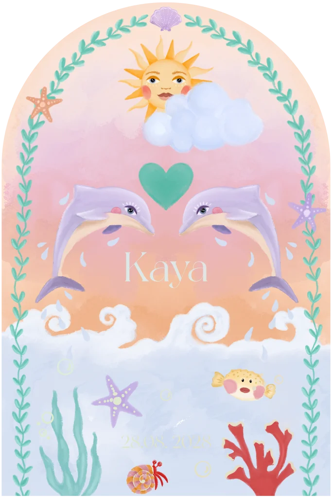 Een kleurrijk boogkaartje in het zeethema. Twee dolfijntjes springend uit het water. Omring door koraal, visjes en zeesterren.