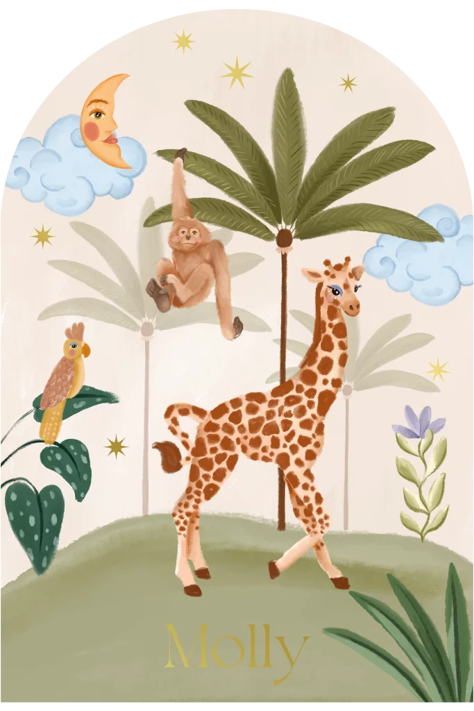 Een boog kaartje in het jungle thema. De giraf speelt de hoofdrol omringd met palmbomen en andere dieren zoals een aap en papegaai.
