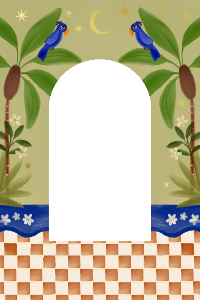Neem een kijkje in het leven in de jungle. Een kaartje vol tropische dieren en planten met papegaaien, palmbomen en een panter Kun jij raden wat er aan de binnenkant van het kaartje afspeelt?