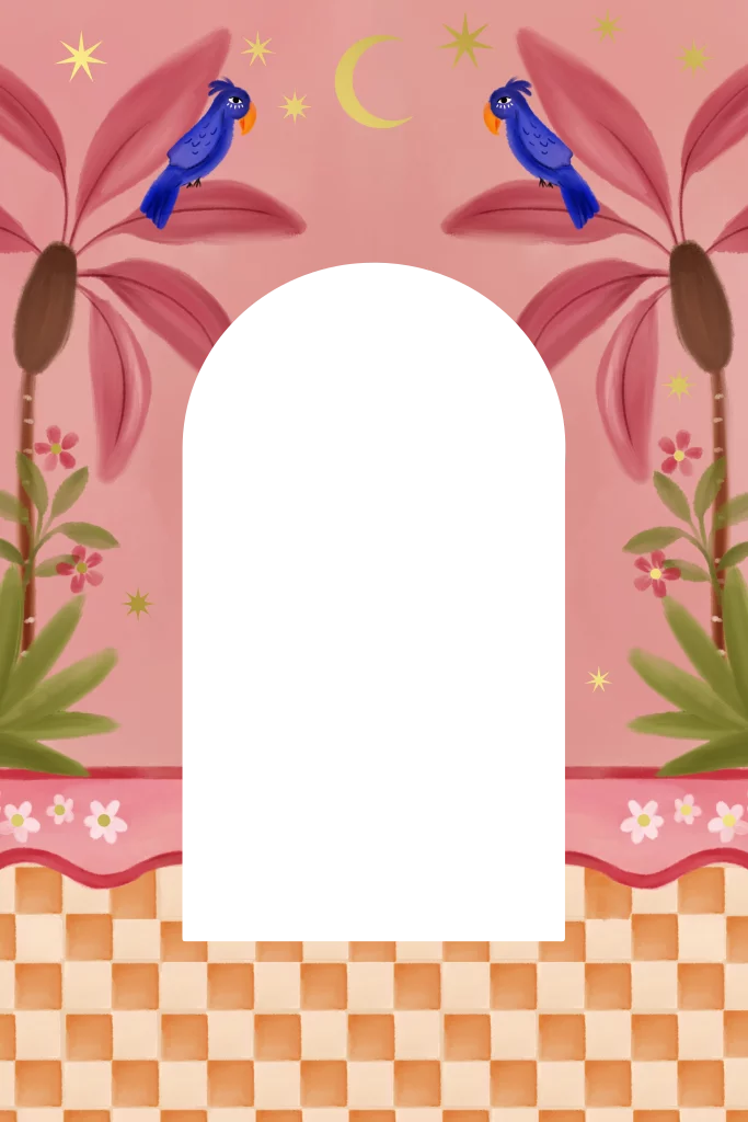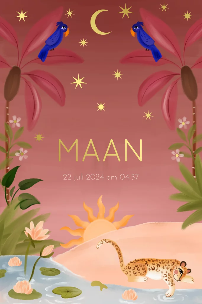 Neem een kijkje in het leven in de jungle. Een kaartje vol tropische dieren en planten met papegaaien, palmbomen en een panter Kun jij raden wat er aan de binnenkant van het kaartje afspeelt?