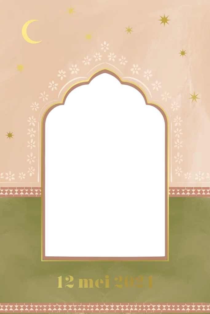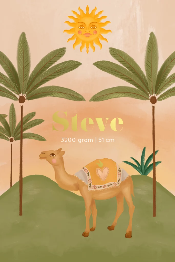 Een geboortekaartje met een oosters tintje. De kameel komt veelvuldig voor in Afrika en Azië. Het dier staat van oudsher symbool voor gehoorzaamheid.