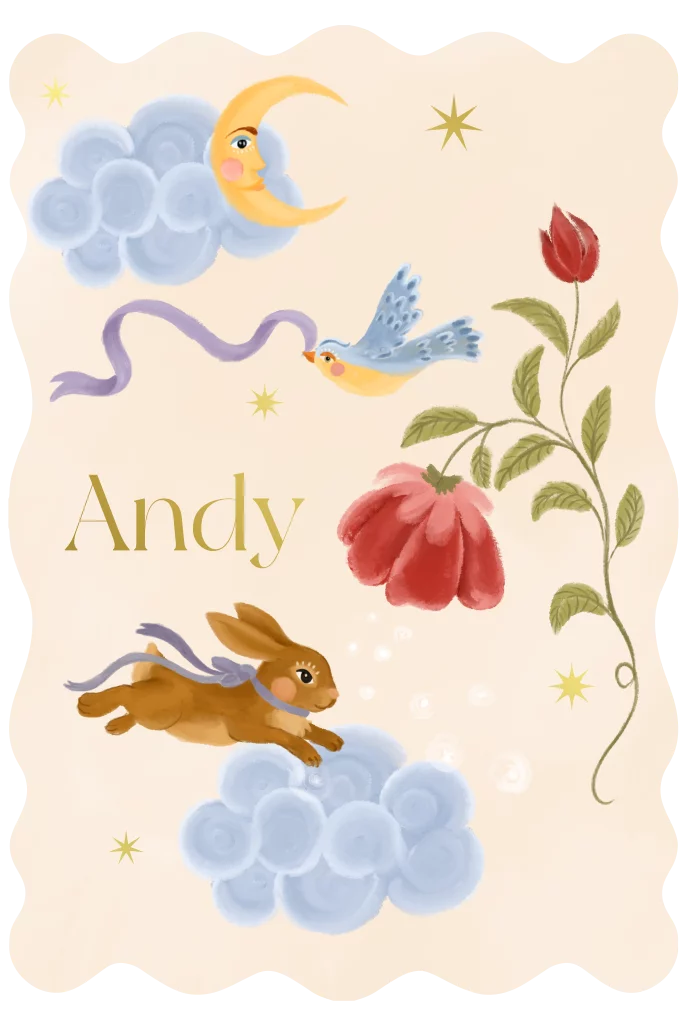 Een schattig konijntje in de wolken. Het kaartje heeft een originele vorm door de gegolfde rand.