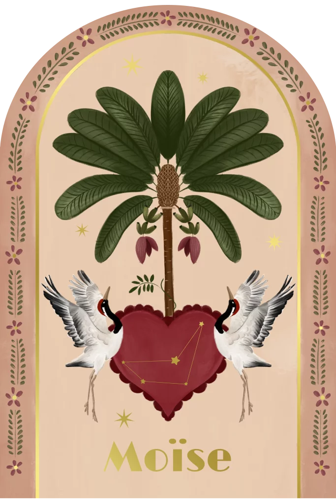 Een beige geboortekaartje met sierlijke kraanvogels. Ze dansen samen rond de palm en het hart. In het hart kun je het sterrenbeeld van jullie kindje plaatsen.