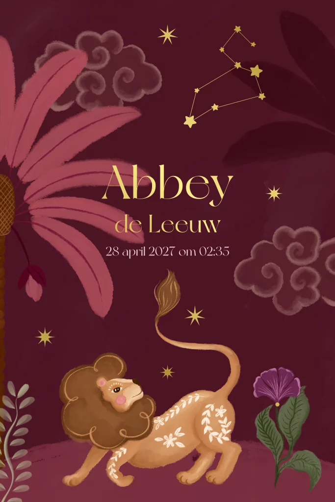 Een geboortekaartje met een sierlijke leeuw. Deze kun je al een beetje vanaf buiten zien via de doorkijk. Afgewerkt met mooie bloemen en een aanpasbaar sterrenbeeld.