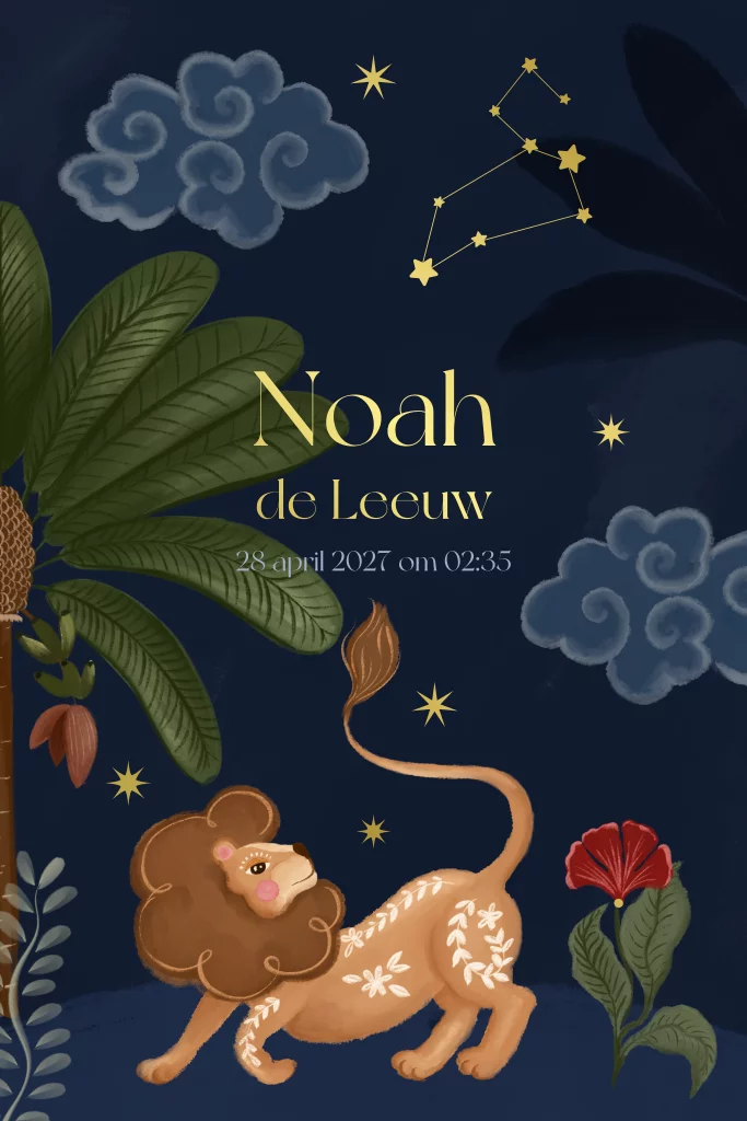 Een geboortekaartje met een sierlijke leeuw. Deze kun je al een beetje vanaf buiten zien via de doorkijk. Afgewerkt met mooie bloemen en een aanpasbaar sterrenbeeld.