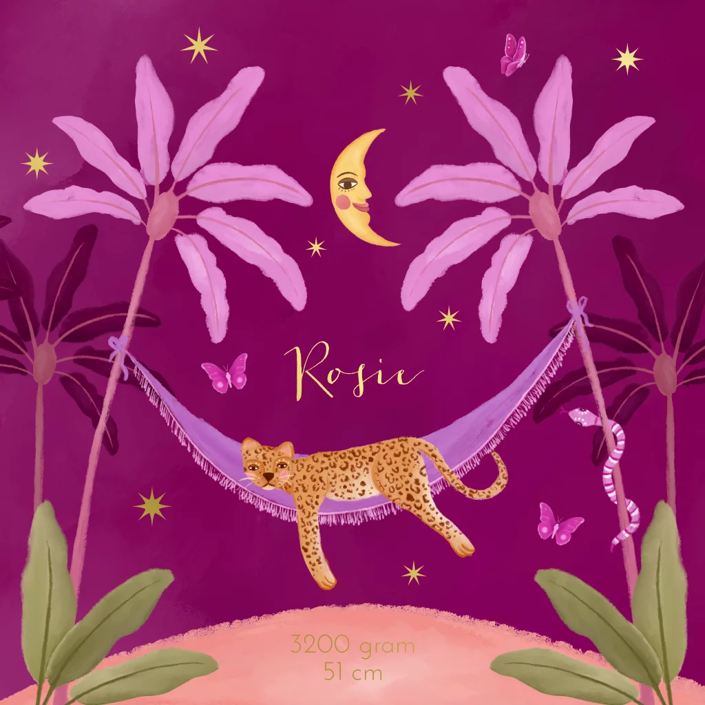 Kijk die luipaard er eens heerlijk bij liggen. Fel paarse en roze kleuren die van het papier knallen!