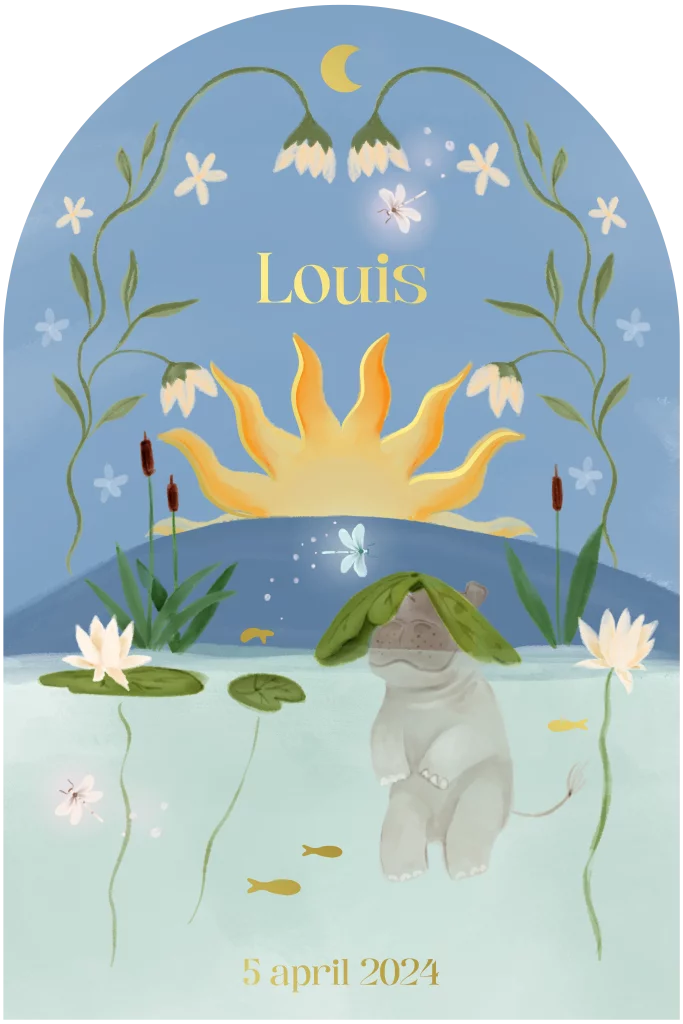 Een boog kaartje met een nijlpaard dobberend in het water. Omring met bloemen, waterlelies en een opkomende of ondergaande zon.